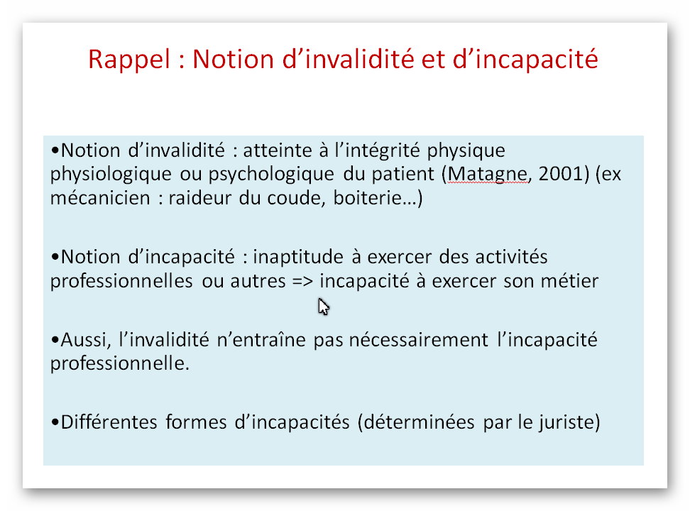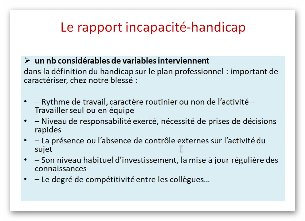 Les « rapport maladie-incapacité » et « incapacité-handicap » sont les 2 problématiques principales