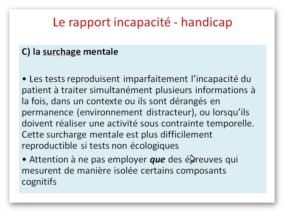 La surcharge mentale est difficilement reproductible et des tests reproduisent imparfaitement la capacité du patient; d’où l’importance du choix des tests.