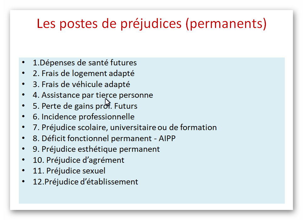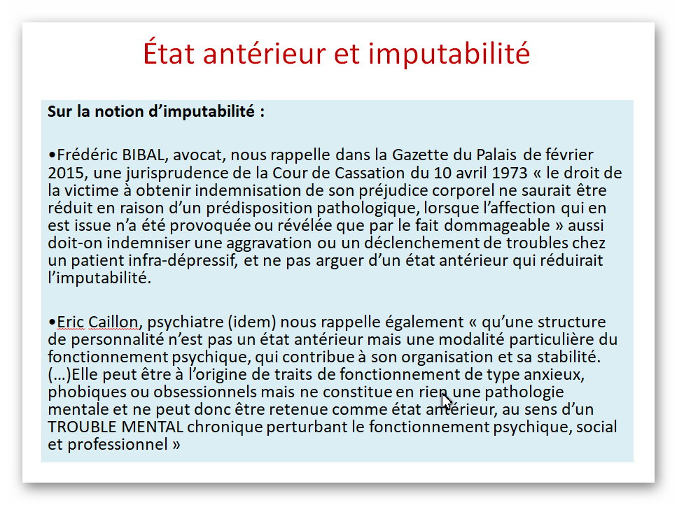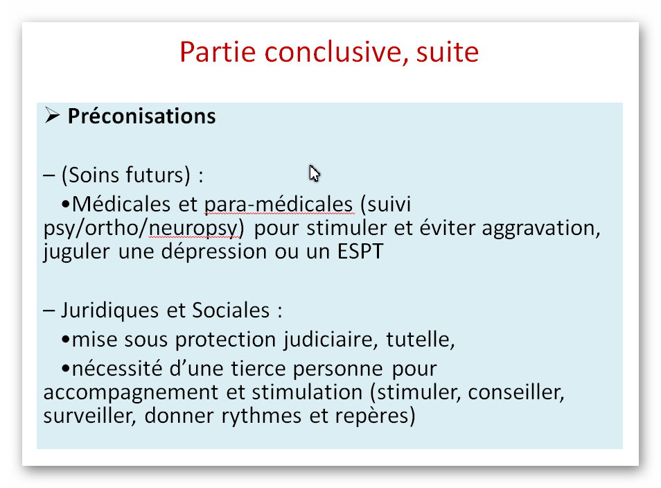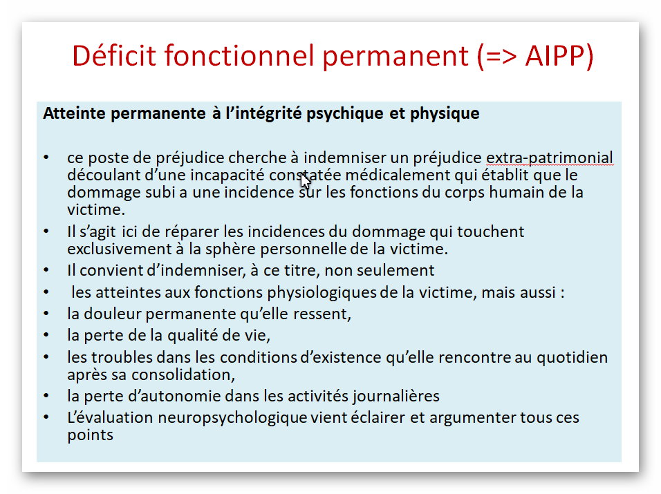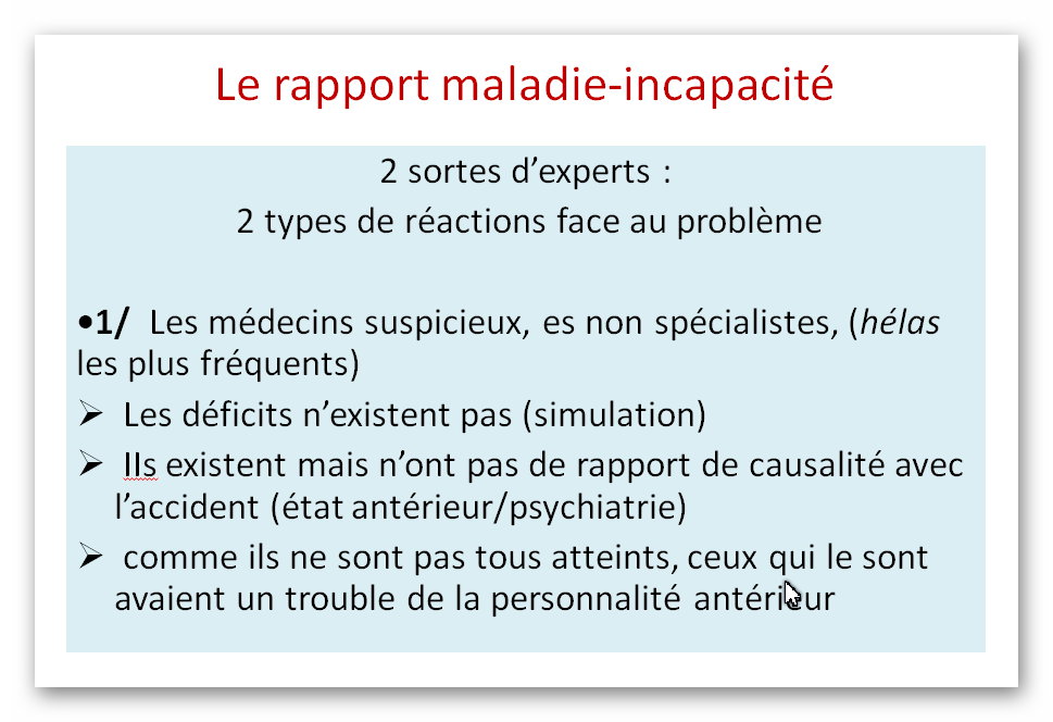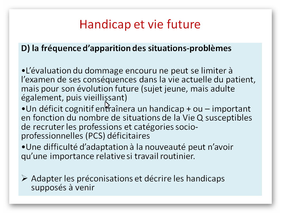 Pour ça il faut avoir une notion du vocabulaire des barèmes pour citer les symptômes précis qui vont être pris en compte par le juge pour les pourcentages. Par exemple barème du concours médical . Il faut citer le terme de syndrome frontal, ça fait référence à des termes que tout le monde connaît: le juriste connaît, le médecin également, plutôt que syndrome dysexécutif !