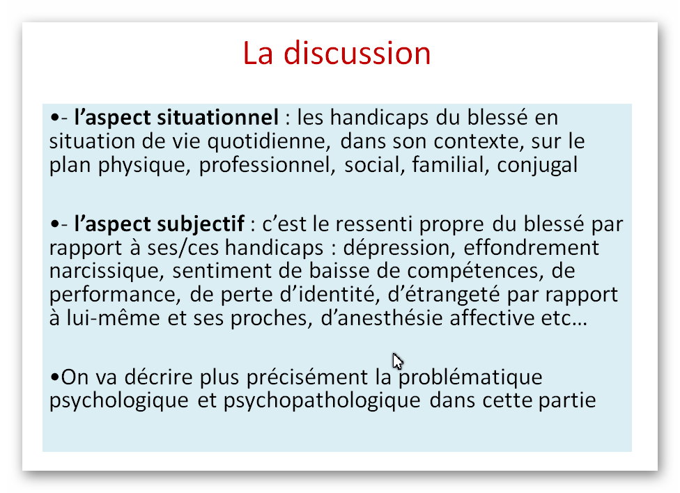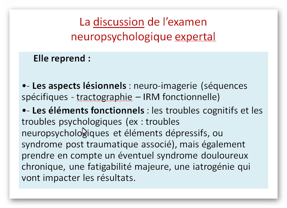 Dans la discussion de l’examen neuropsychologique on va reprendre les aspects lésionnels, les éléments fonctionnels et faire aussi le lien avec les traitements.
