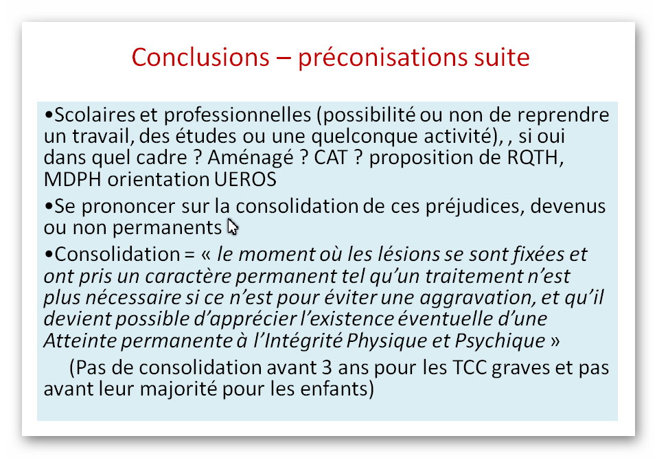 Dans les préconisations il faut insister sur le fait que les soins futurs sont destinés à éviter une aggravation, mais que la consolidation est déjà effectuée. Les assurances cherchent souvent à utiliser les préconisations médicales pour contester la consolidation et repousser les décisions.