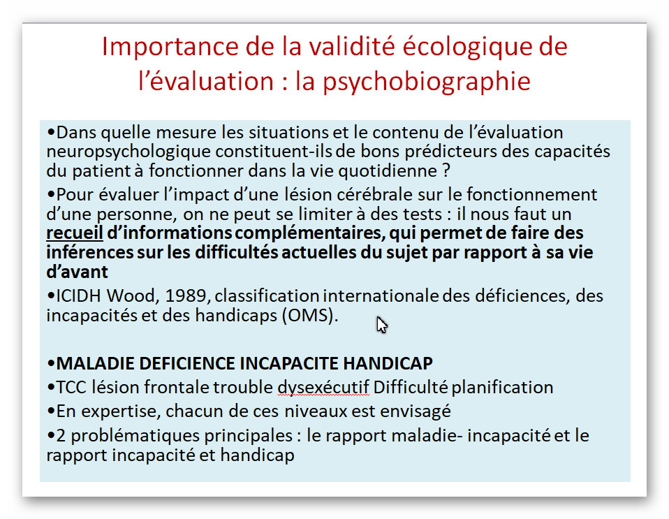 Les neuropsychologues peuvent se prononcer sur le maintien des connaissances, mais beaucoup moins sur l’expertise du sujet. Ce qui a été acquis antérieurement peut être altéré et non mesuré par l’évaluation ; d’où l’importance de la psychobiographie, et demander aux patients très précisément ce qu’il pouvait faire avant.