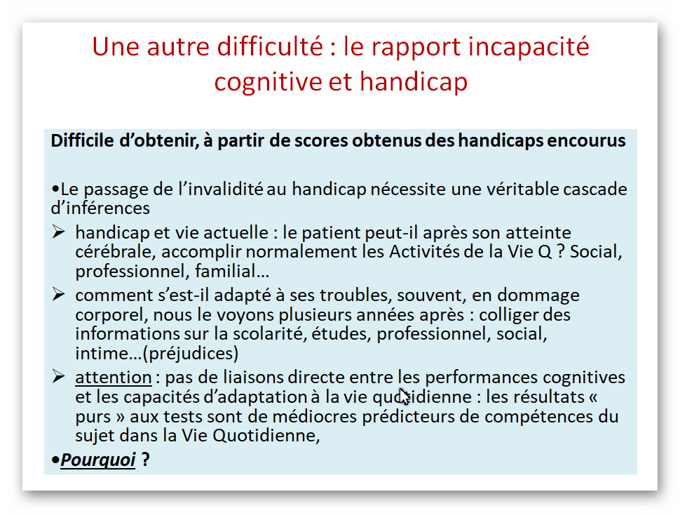 Il y a aussi une absence de liaison directe entre les performances cognitives et les capacités d’adaptation à la vie quotidienne parce que, dans l’examen neuropsychologique, on peut passer à côté parce que certains processus n’auront pas été explorés tout simplement.